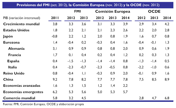 En el contexto internacional, CEOE recoge las últimas previsiones económicas, tanto del FMI como de la Comisión Europea y de la OCDE, de octubre y noviembre, que apuntan a una desaceleración del crecimiento mundial en los meses finales de 2012 y una recuperación paulatina y moderada a lo largo de 2013.