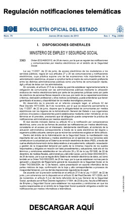 El Boletín Oficial del Estado publicó, el pasado 28 de marzo, la Orden ESS/485/2013, por la que se regulan las notificaciones y comunicaciones por medios electrónicos en el ámbito de la Seguridad Social, por la que entra en vigor la obligatoriedad de las empresas de recibir sus notificaciones de la Tesorería General de la Seguridad Social por vía telemática.