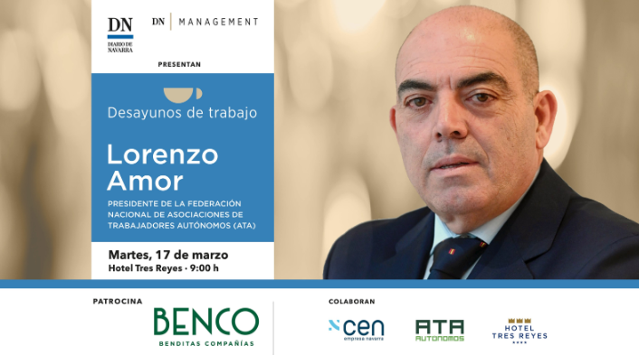 CEN colabora en el Desayuno de trabajo organizado por DN Management, que tendrá lugar en el Hotel Tres Reyes. El encuentro contará con Lorenzo Amor, presidente de ATA. Esta jornada es una oportunidad para conocer de primera mano la visión de Lorenzo Amor sobre los retos y oportunidades del tejido empresarial y del trabajo autónomo en España, así como para compartir experiencias y generar sinergias entre profesionales y empresas de Navarra.