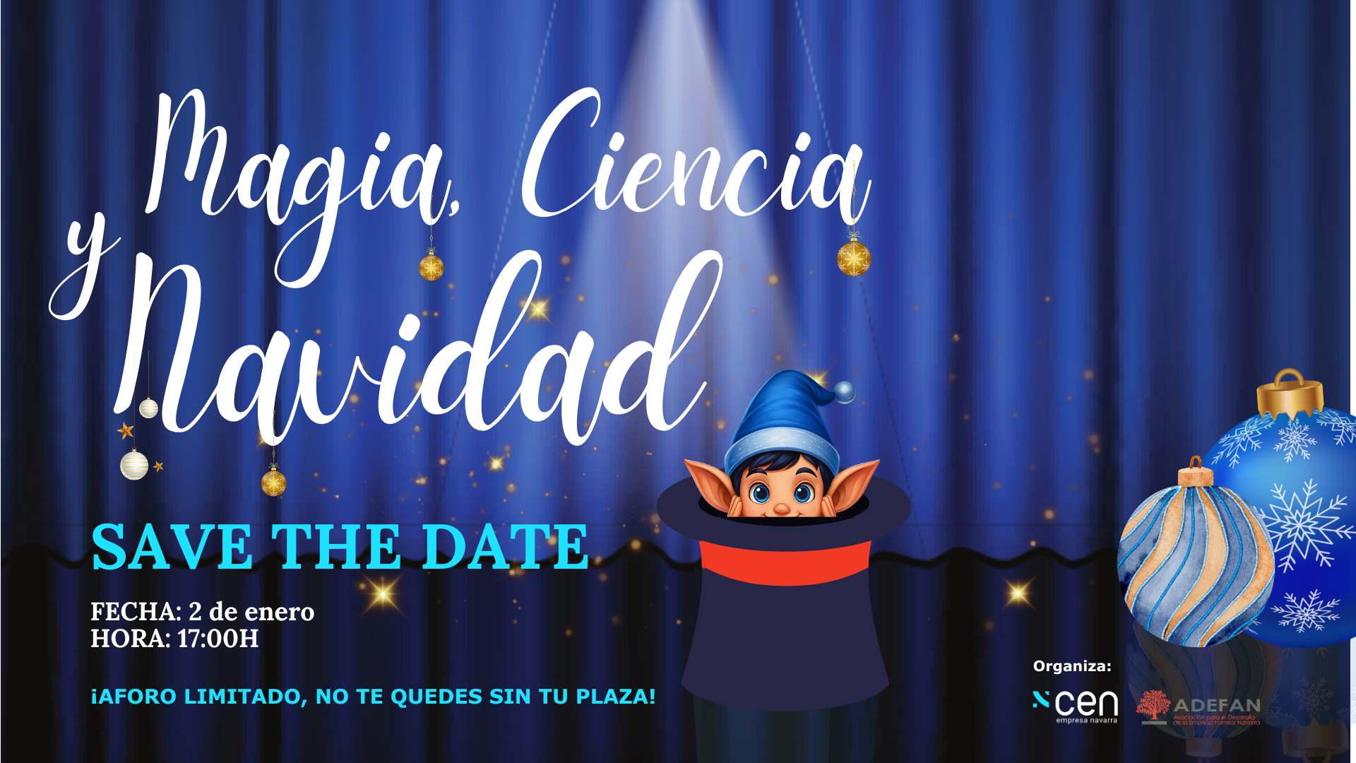 El próximo 2 de enero por la tarde, los duendes de la Navidad llegan a CEN y lo hacen para invitarnos a disfrutar de un espectáculo único que combina magia, ciencia y espíritu navideño. Organizado por CEN y de la mano de Adefan tendremos una tarde llena de sorpresas. Un evento especial pensado para nuestros asociados y familias en el que nada más entrar te acompañarán nuestros duendes para pasar juntos una tarde divertida, sorprendente y llena de ilusión. ¡No te lo pierdas! Ven a disfrutar de la creatividad, la ciencia y la magia de la Navidad en un ambiente familiar y festivo. Reserva la fecha y en breve lanzaremos el link de inscripción.Los duendes de la Navidad te esperan.